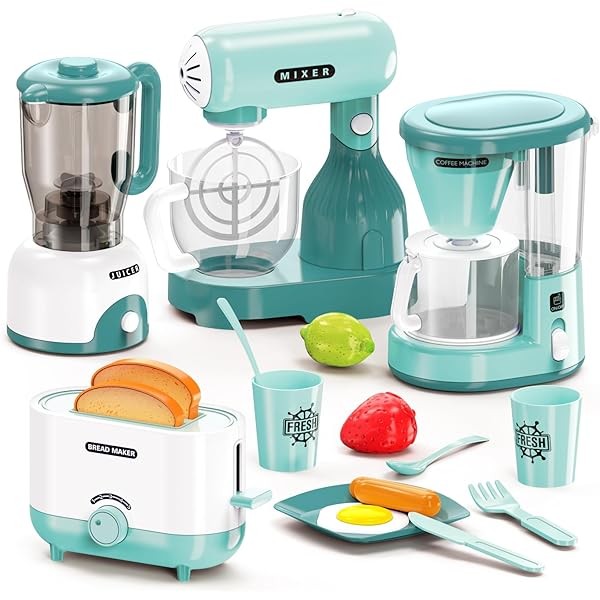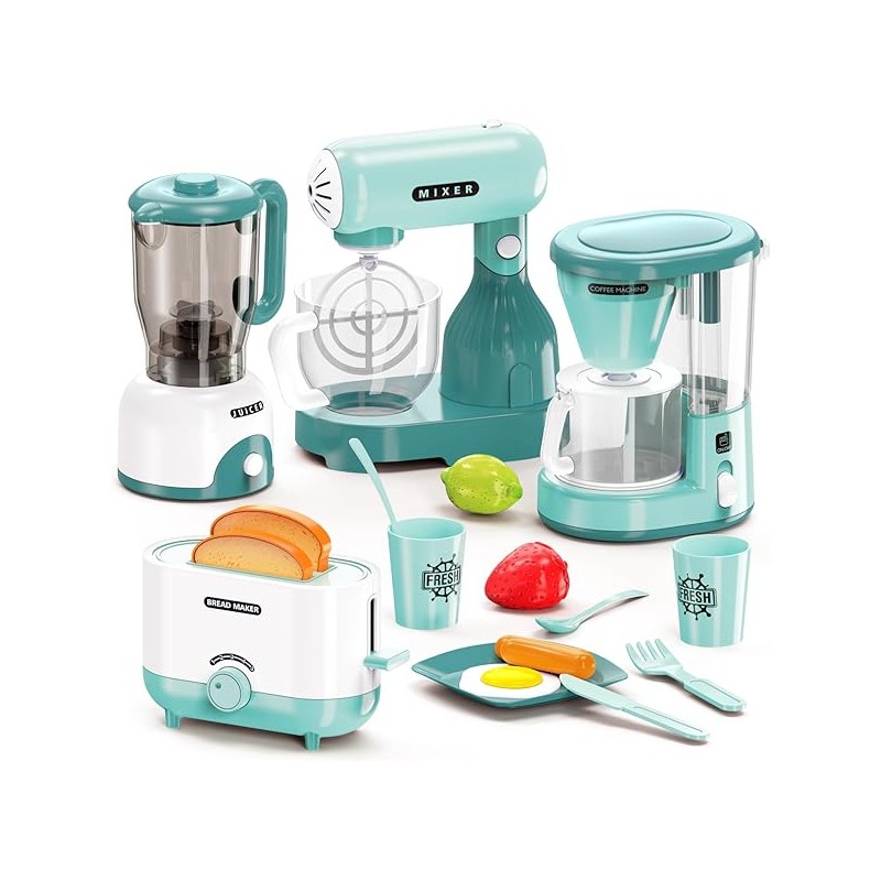 Kids Play Kitchen Accessories Toys Set, Pretend Play Kitchen Appliances Kit - Blender, Coffee Maker, Mixer, Toasters with Light & Sound, Playhouse Role Play Toy Gift for Girl Ages 3 4 5 6