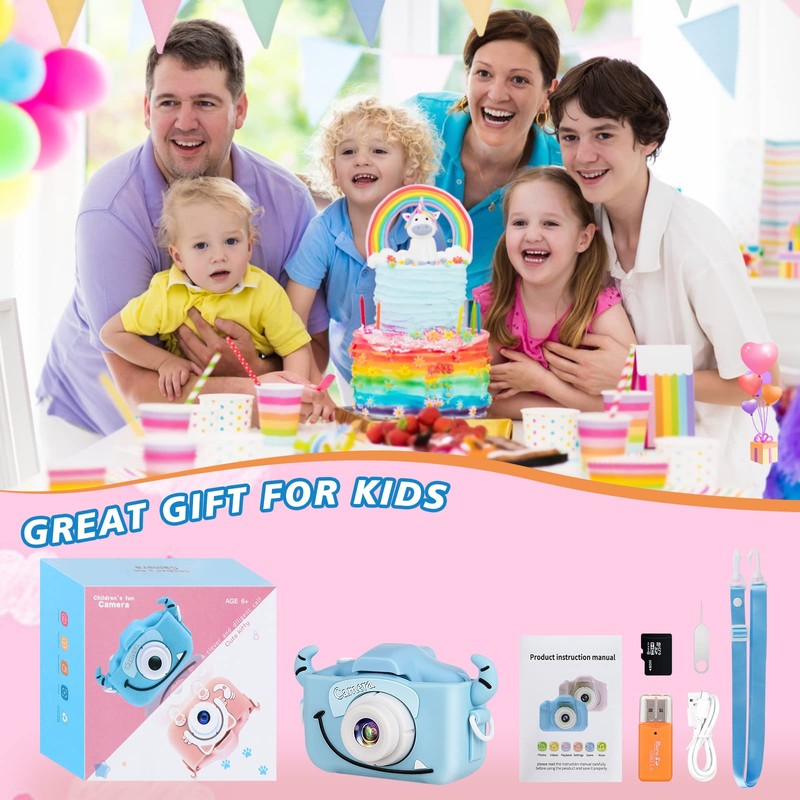 - 📷 【More Fun】 The HD digital video cameras for kids supports continuous shooting, timed shooting, self-timer, video recording, date setting and so on, which can meet various needs in different situations. Environment-friendly materials, non-toxic, perfect mini video camera for kids.Built-in rechargeable battery, this toddler camera easy to charge via USB. This child recording camera supports a maximum of 32GB SD card ( included 32GB memory card ).