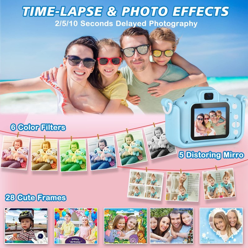 - 📷 【Multiple Functions Kids Camera Toys】 This camera for kids has 28 cartoon sticker photo frames and 11 filters. It has both a rear and front facing camera with 2.0 inch 1080P IPS eye protection screen which can avoid harming your child's vision. Support self-timer, flash, playback, recording, and puzzle games.