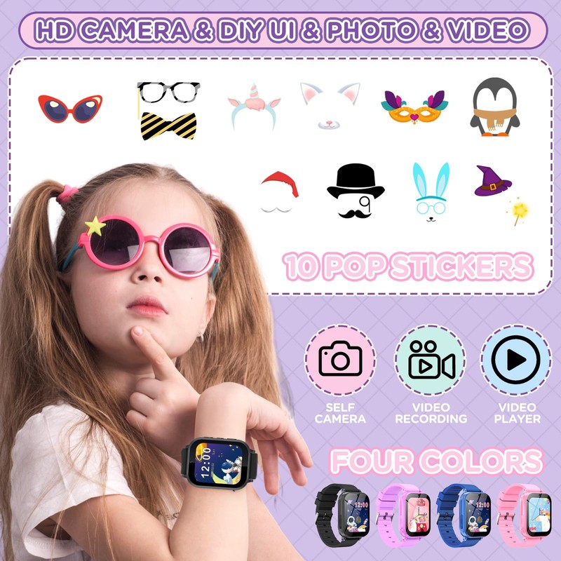 - HD Camera & Protect Eyesight - Smartwatch for kids equipped camera upgraded to 300,000 pixels, helps protect kids eyesight health. Smartwatch kids supports high-resolution images, kids capture wonderful photos and record clear videos. Your kids can take photos and selfies by themselves. kids watches 8 year old girl birthday gift has 10 cute special effects magic stickers built in, watches with camera can customize photos as wallpapers, helping to stimulate kids imagination and creativity