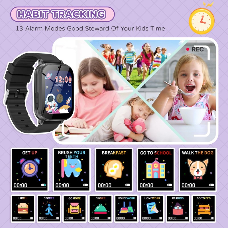 - Long Battery Life & Habit Tracking - Game watch comes with a 500mAh large-capacity battery, fully charged in 2 hours, kids digital watch working time can be up to 5-7 days. Children smart watch has 10 habit tracking, improving kids time awareness and promoting the development of kids gross motor skills. Included: 1x smartwatch, 2x smartwatch band, 1x exquisite packaging box, 1x Type C charging cable, 1x 512MB SD card, 1x user manual, 1 x screen protector