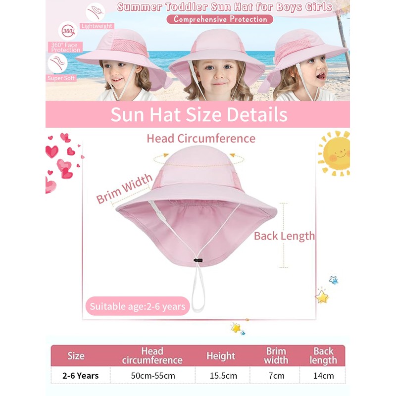 【Full Sunscreen】Made of 50+UPF fabric, which can block 98% of ultraviolet rays. The 3.5inch (9cm) wide brim and 6inch (15cm) neck piece are enough to protect your child's face and neck from the sun while not obstructing their view.