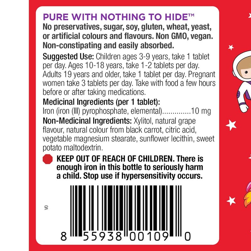KidStar Nutrients BioFe Pure Iron Chewables, Natural Grape Flavour, 10 Mg Iron Per Tablet, No Sugar, 60 Chewable Tablets