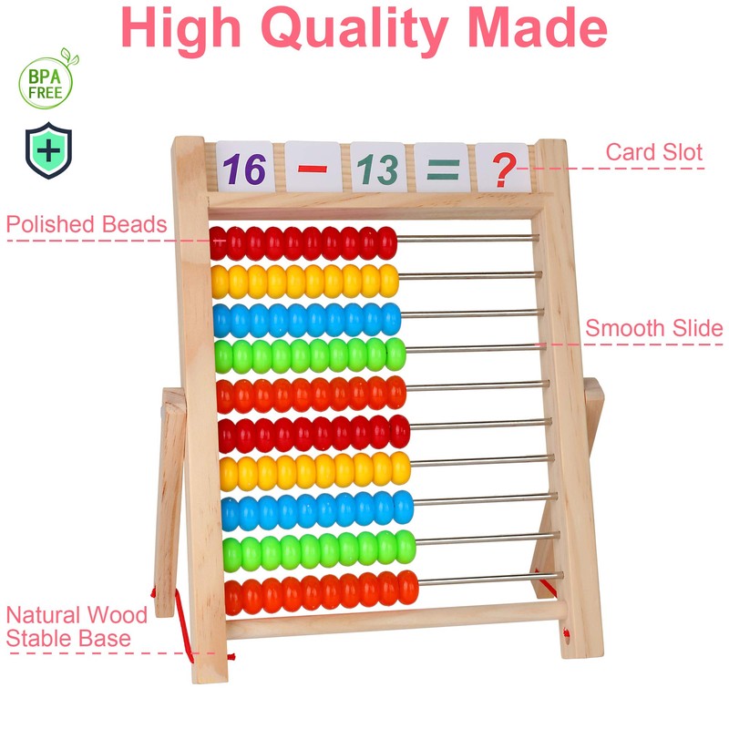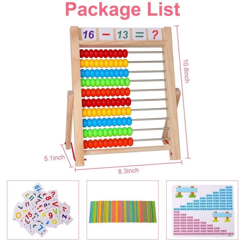 - 【What You Get】(1) 1*Wooden Frame Abacus; (2) 52*Alphabet Card(including capital and small); (3) 21*Number Card(0-20); (4) 7*Symbol; (5) 100*Counting Stick; (6) 1*Addition/Subtraction/Multiplication/Division Table.