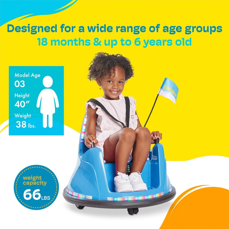 • [Safety and Durability] The electric bumper car is made of durable and non-toxic plastic. It features adjustable 5-point seat belts, anti-flat tires, and a cushioned rubber at the bottom to reduce bumps. Thanks to a slow start safety-feature, every ride is smooth and easily controlled. It complies with ASTM/CPSIA/CPSC/CA Prop 65/FCC safety regulations, and comes with a racing flag for increased visibility.