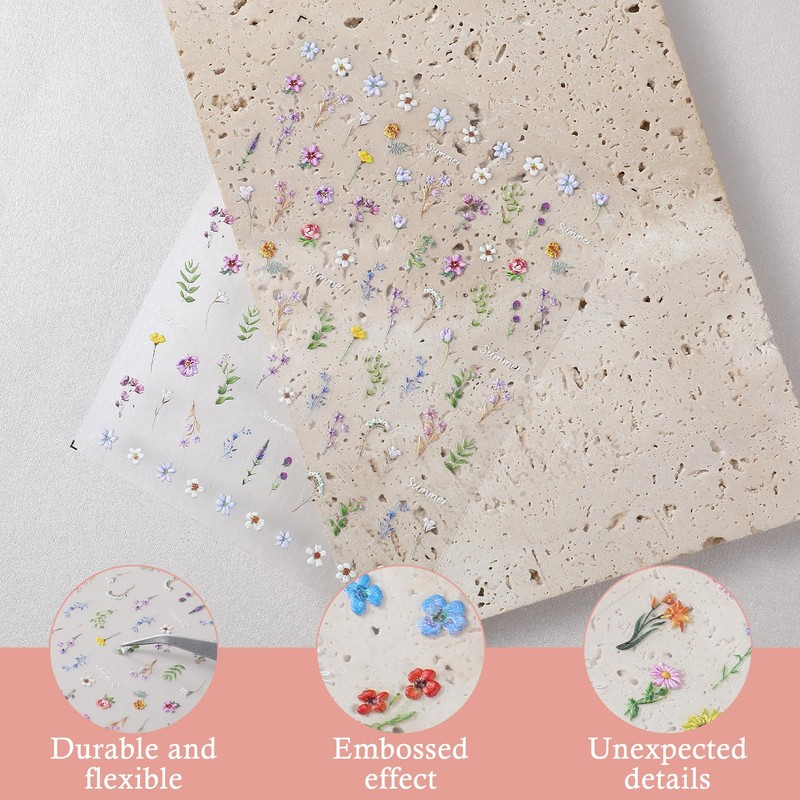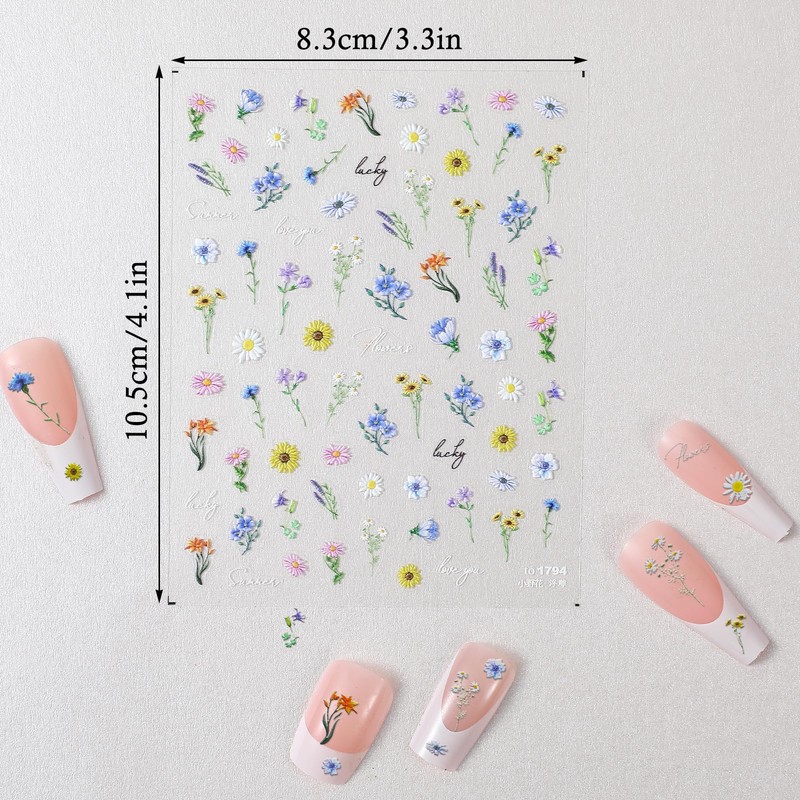 - Premium Spring Nail Stickers: The multi-color oil painting wildflower stickers are crafted from plastic and feature a high-quality adhesive. These 3d nail art stickers are thoughtfully designed and reliable, ensuring that they do not easily fall off after being applied. You can use them with complete confidence.