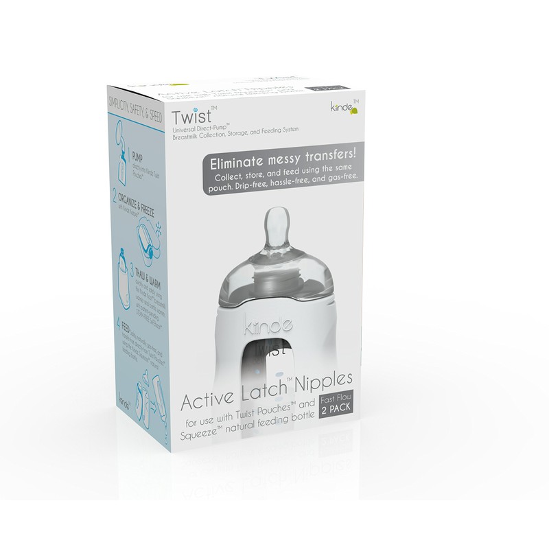 Kiinde (pronounced Kind) is pleased to offer innovative active latch nipples that make it easy for your baby to switch between bottle and breast. The Kiinde Twist system is a perfect baby shower present for new parents since it makes feeding a little one easy. Our system allows you to collect, store, prepare, and feed using a single squeeze pouch. In addition to this 2-pack of fast-flow nipples, you can purchase Kiinde milk bags, bottles, pump adapters, storage shelves, and our bottle warmer. All bottle parts are safe for the top rack of your dishwasher and can be steam-sterilized. Feed your baby directly from Kiinde Twist Pouches using our Twist Squeeze Natural Feeding Bottles and Active Latch Nipples. Since the bag collapses as Baby eats, these expertly designed breast milk storage bags can help eliminate colic and upset tummies. These nipples are designed specifically to ease the transition between bottle and breast. Variations in texture encourage a deep, natural latch, and the oval shape forms an air-tight seal with a baby’s lips to prevent air ingestion. The squeeze bottle design also eliminates the need to transfer milk from bags to bottles. Simply snap the pouch into the bottle, squeeze the air out, and pop the Twist Active Latch Nipple on top. Kiinde Twist Bottles also make it easy to send your little girl or boy to daycare with all the food they’ll need. Our leak-proof bottles offer the best alternative to breastfeeding when you can not be with your child and they encourage proper latching activity. Our Twist Pouches make thawing breast milk easy and they travel great. Feeding a baby with pumped breast milk has never been easier. Add this to your baby registry today.