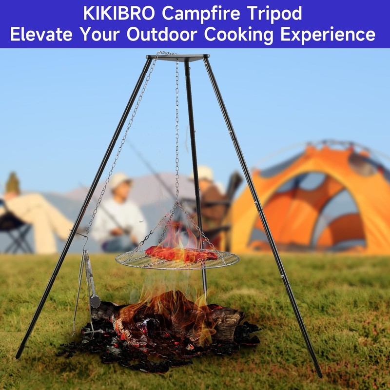 KIKIBRO Campfire Tripod Grill, Cooking Grate with Adjustable Height for Cooking Over Fire & Collapsible Legs for Easy Storage