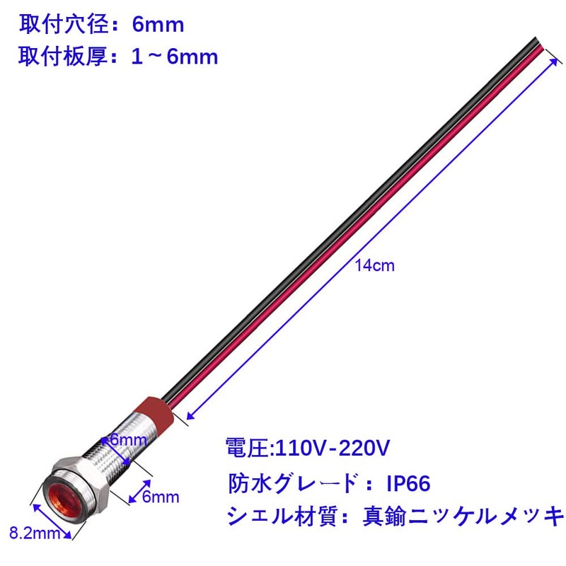 - Rated Voltage: AC 110-220V Volts; Mounting Hole Diameter: 0.2 inches (6 mm); Cable Length: 5.5 inches (140 mm). Rated Current: 20 mA, Rated Power Consumption: 0.06 W.