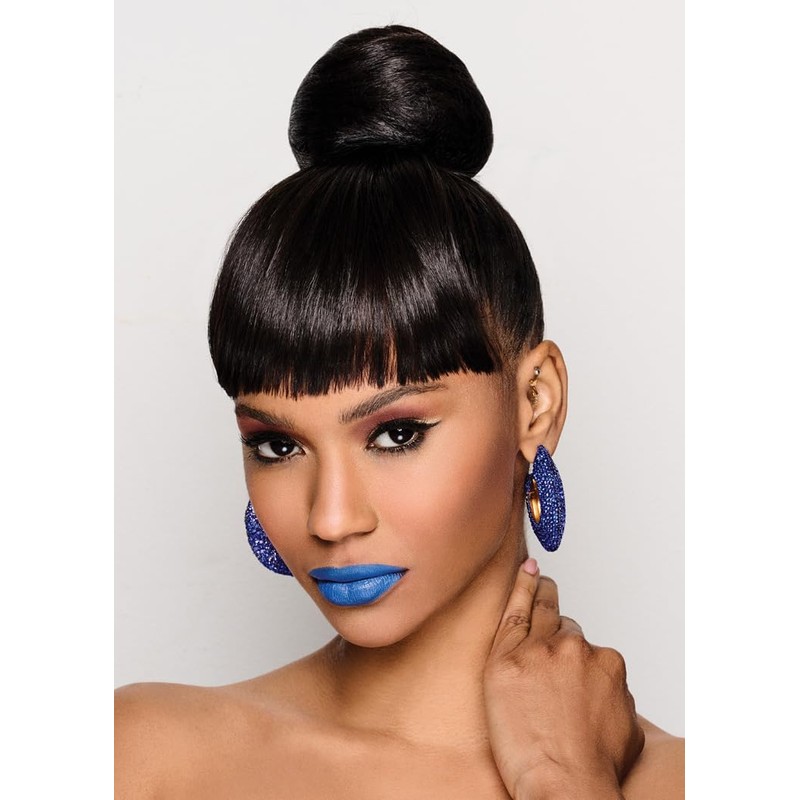• CLASSIC BUN & BANGS STYLE: Style the bun messy or brush around into a sleek ballerina updo. The face-framing fringe is layered with longer side pieces that can be blended with your own hair