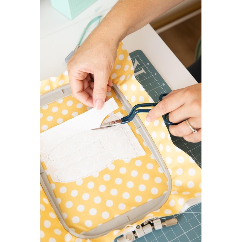 Trim fabric in small spaces with 6” Double-Curved Applique Scissors! Perfect for in-the-hoop machine embroidery projects, the curved design is easy to control and features extra-sharp blades and large, coated rings for a comfortable fit. Choose between right or left-handed scissor options!