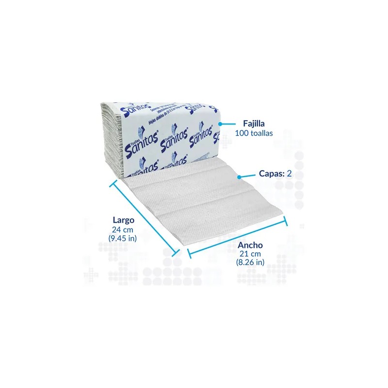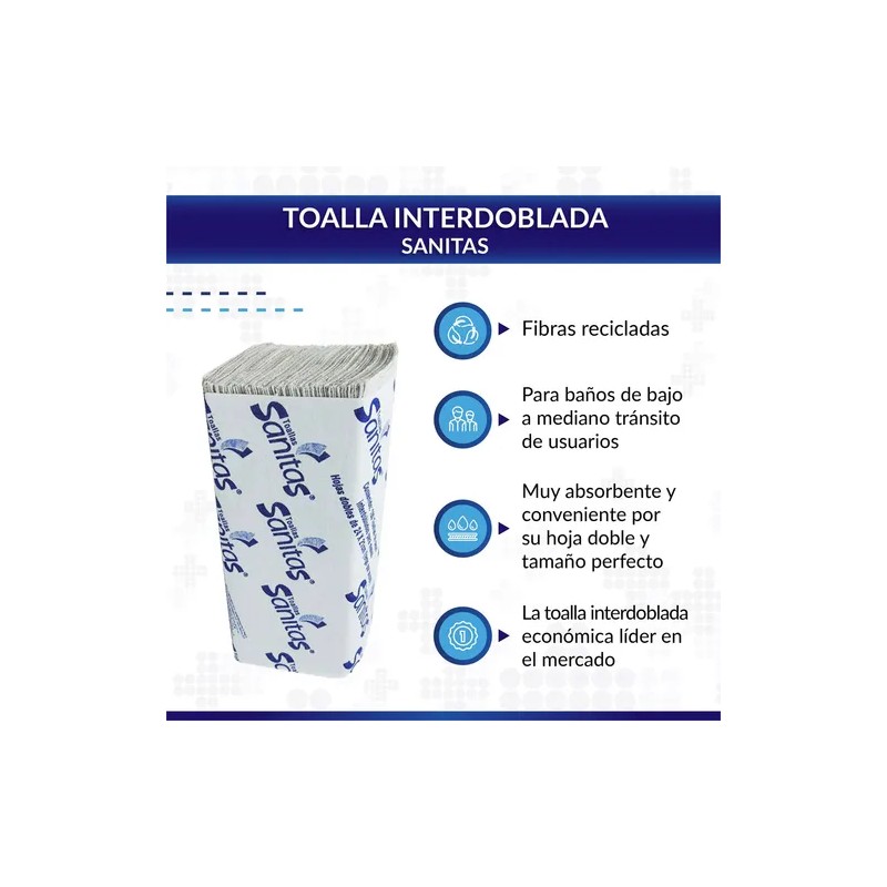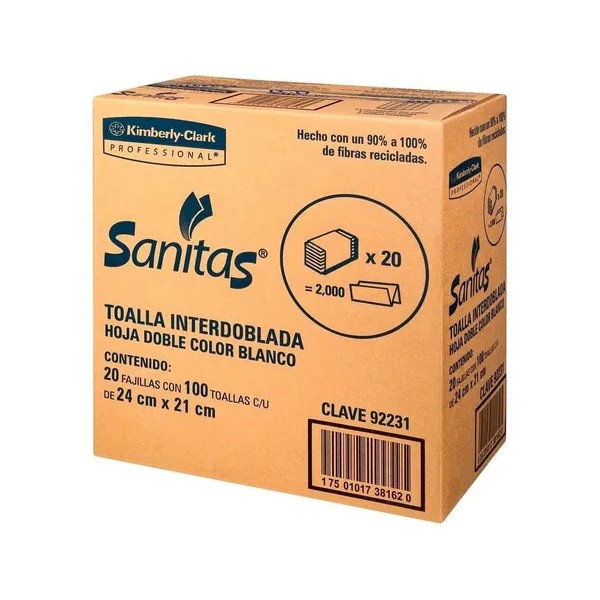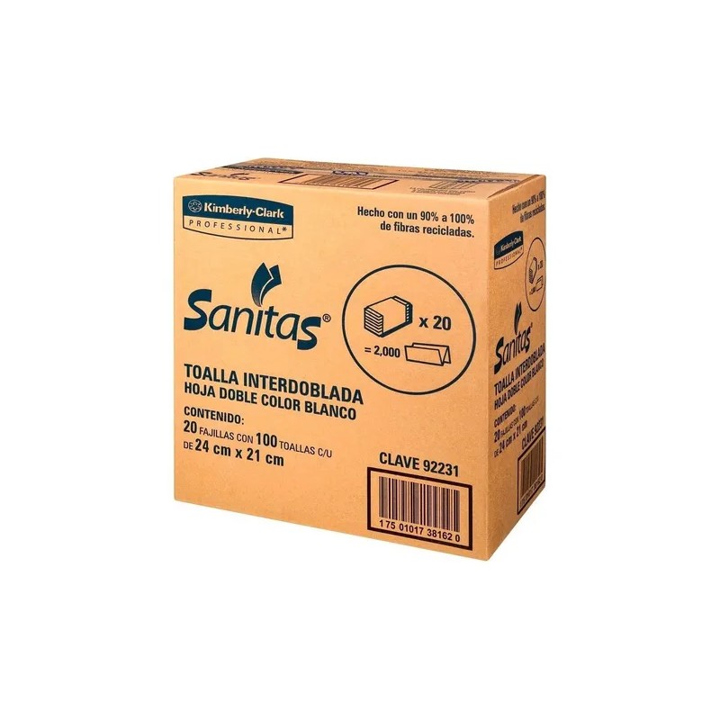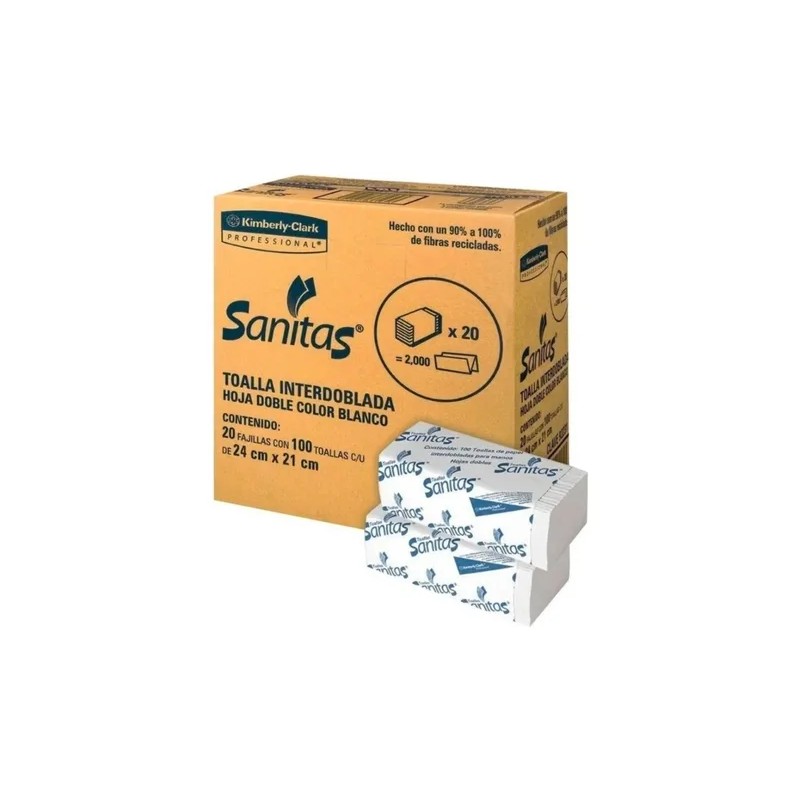 Descripción Limpia: Toalla interdoblada Sanitas en caja con 20 paquetes, cada uno con 100 hojas.
