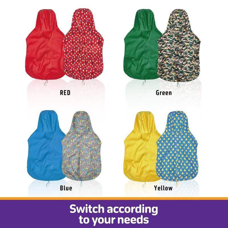 - 🐶【2 in 1 Reversible Design】Kimee reversible stylish slicker poncho can easily transform from solid color to cute pattern design (duck, colorful raindrops, camouflage forest, and romantic rain gear). Simply flip the raincoat around, and you will get your doggie a brand-new raincoat!