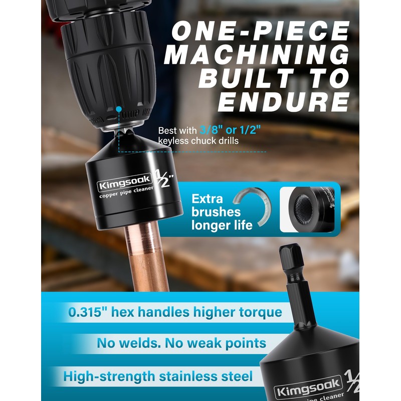 • Premium & Durable: Kimgsoak copper pipe brush features a one-piece stainless steel body with no welds, a 0.315" hex shank for higher torque, and replaceable brushes for longer life.