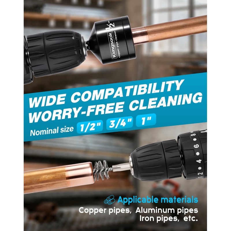 • Wide Applicability: The copper cleaning brush applicable nominal size: 1/2", 3/4", 1". Applicable Materials: Copper pipes, Aluminum pipes, Iron pipes, etc. Best with 3/8" or 1/2" keyless chuck drills.