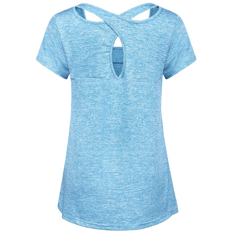 Kimmery Yoga Tops,Loose Fit Sweet Wicking Short Sleeve Scoop Neck Cross Cut Back Tops Summer Work Out Home Gym School Camping Athleisure Wear Light Blue M