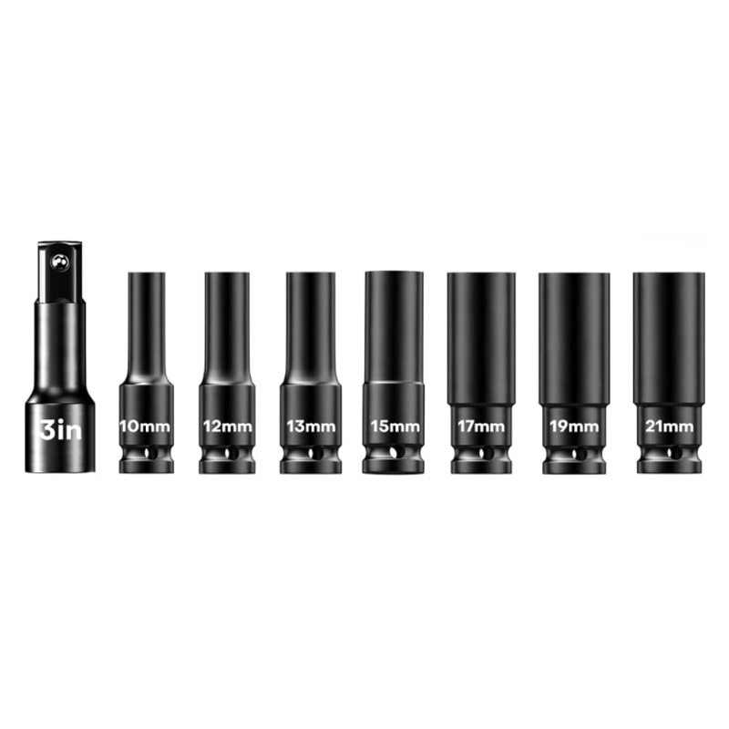 - [8pcs Drive Impact Socket Set] This socket set comes with 8pcs size: 10mm, 12mm, 13mm, 15mm, 17mm, 19mm, 21mm