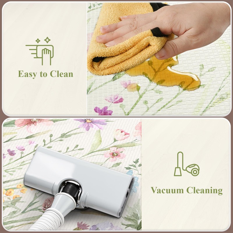 - Easy Care and Clean:Simply vacuum regularly, shake or sweep off debris, and spot clean with a solution of mild detergent and water when needed. Support wipe clean and vacuum clean,air dry and dry flat.This advantage saves you a lot of time in cleaning the mat