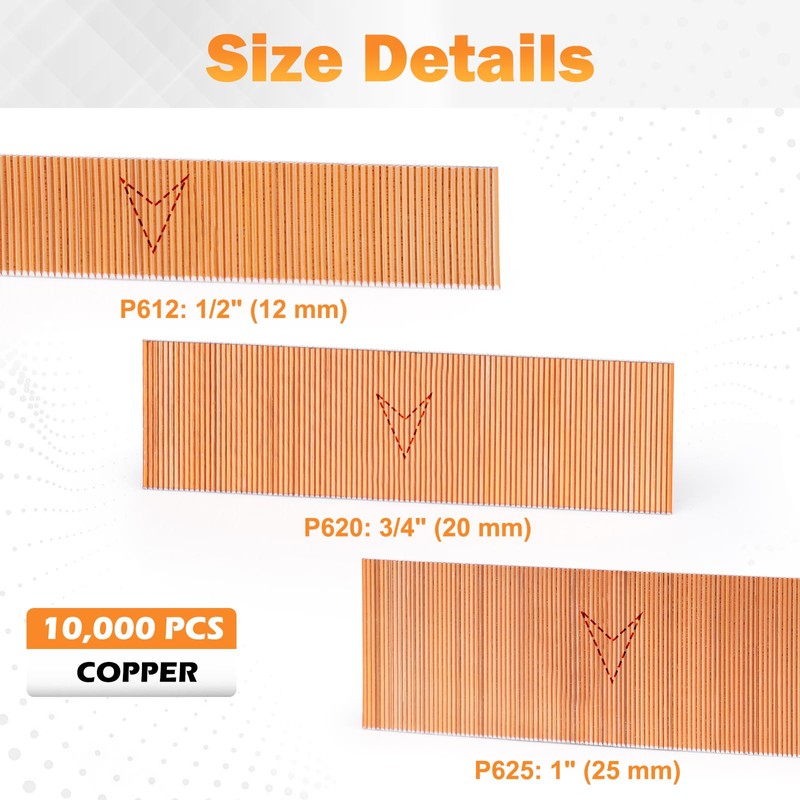 • Good quality: Has high tensile strength and long durability; ◈Made of steel with copper coating, smooth surface, no burr, and anti-corrosion. Less jamming; ◈ An obvious arrow mark on each nail row to alert the loading of nails in the right direction