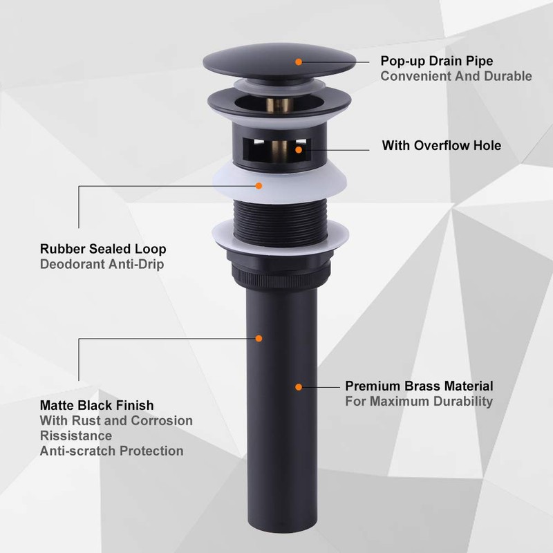 - PREMIUM MATERIAL - Pop-up drain stopper, drain flange, threaded pipe are made from brass, tailpiece is made from stainless steel. All metal construction for maximum durability.