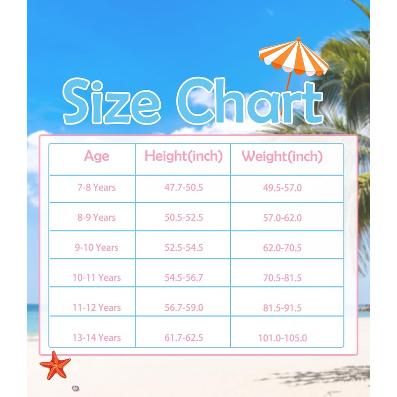 - GARMENT CARE: Kinberr swimming suits are suitable for girls aged 8-14, please refer to our size chart on the product page. Please wash with cold water below 30°C. If you have any questions for our products, we will try our best to help you.