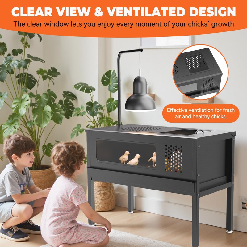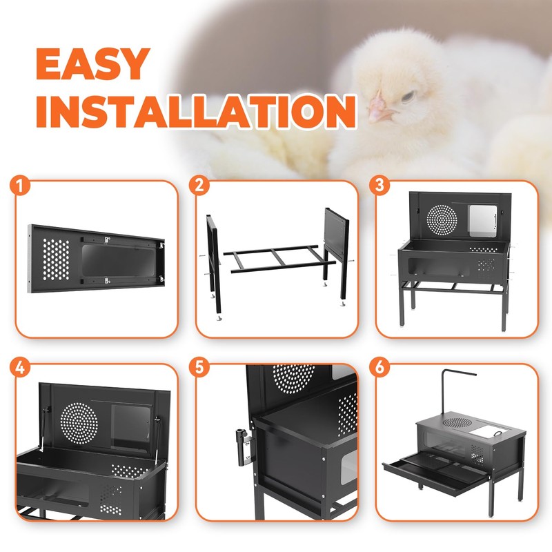 Give your chicks the secure start they deserve! Our all-metal brooder combines industrial-strength construction with smart, user-friendly features. The hydraulic-assisted lid lifts smoothly with one finger for instant access, while the seamless one-piece design ensures perfect insulation and durability. Control airflow precisely through the removable top vent window, and experience stress-free maintenance with the slide-out tray – simply add a mat liner for 30-second, mess-free cleanups. Built to last through seasons of healthy chick-raising.