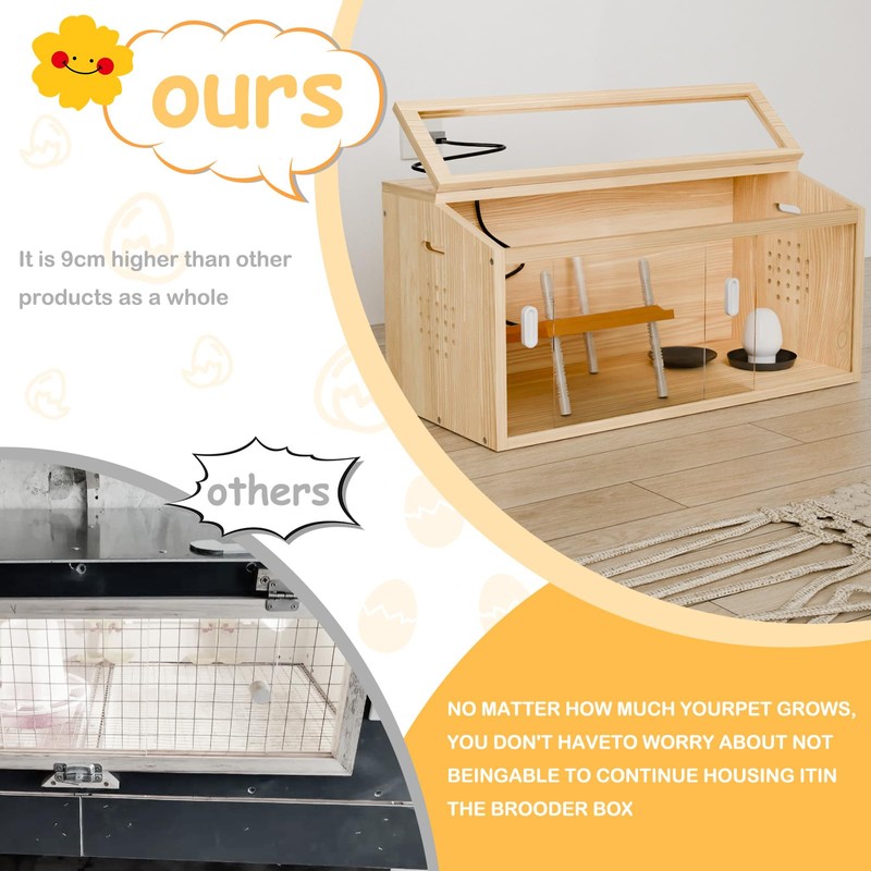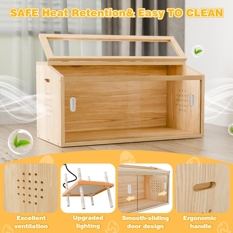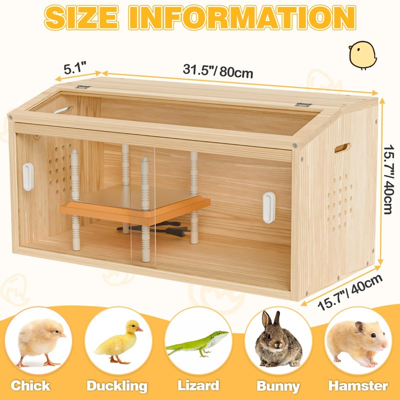 - Spacious Interior & Easy-Clean Design- A generous 31.5 in L × 15.7 in W × 15.7 in H footprint lets chicks stretch and flap without crowding, while smooth wooden walls and two wide, side-sliding acrylic doors up front give you instant reach-in access to swap bedding and wipe surfaces in under a minute