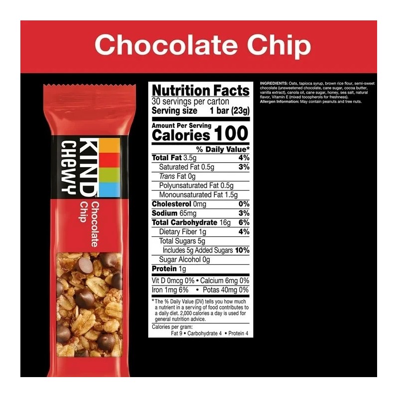 Oats, tapioca syrup, semi-sweet chocolate (unsweetened chocolate, cane sugar, cocoa butter, vanilla extract), canola oil, cane sugar, honey, brown rice, brown rice flour, sea salt, natural flavor, Vitamin E (tocopherols to maintain freshness).