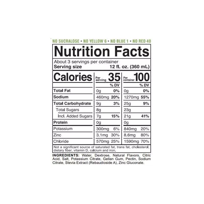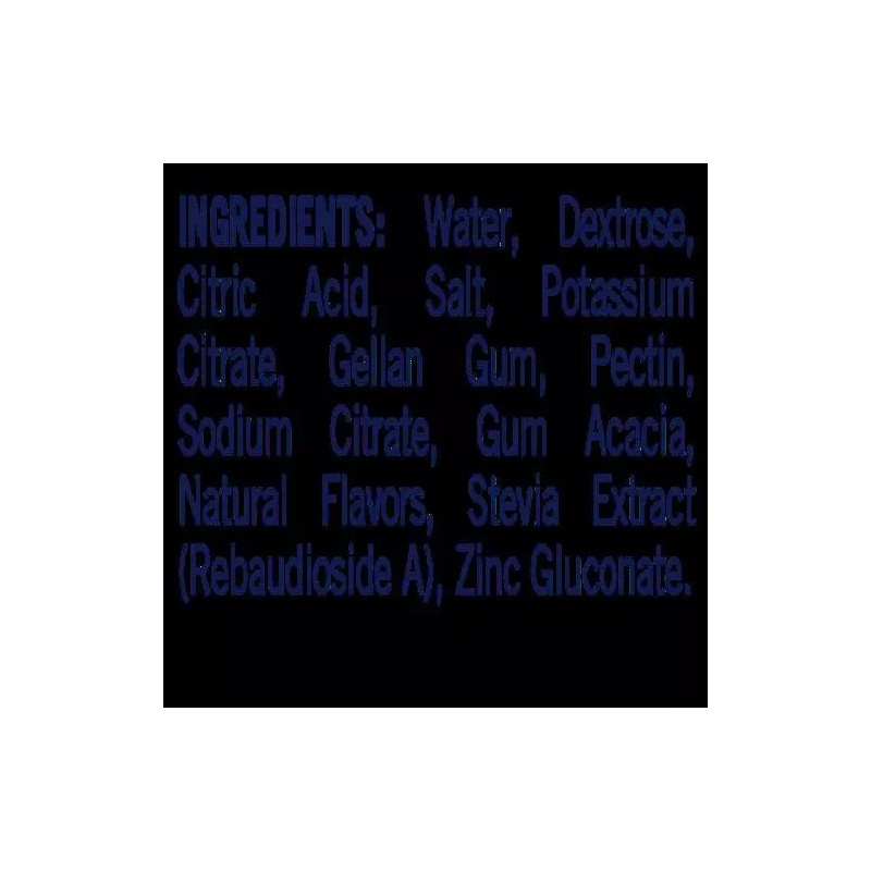 Water, Dextrose, Natural Flavors, Citric Acid, Salt, Potassium Citrate, Gellan Gum, Pectin, Sodium Citrate, Stevia Extract (Rebaudioside A), Zinc Gluconate