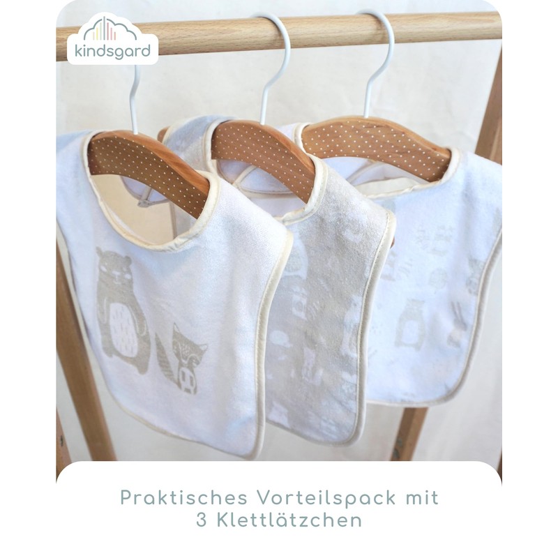 Kindsgard Happaklat Velcro Bibs Pack of 3 - Quick To Put On & Take Off - Baby Bib - Burp Cloths Baby - Washable up to 40°C, Forest Animals Beige