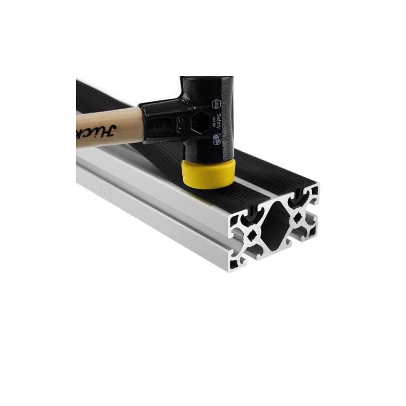 The cover profile 8 32x4 made of NBR (acrylonitrile butadiene rubber) serves as an elastic cover on the aluminium profile. The cover profile is pressed onto the profile groove with the "rubber nose". For assembly, a soft hammer can be used for help. The numerous grooves on the rubber profiles ensure a non-slip support for stairs or handling fragile materials (e.g. glass panes).