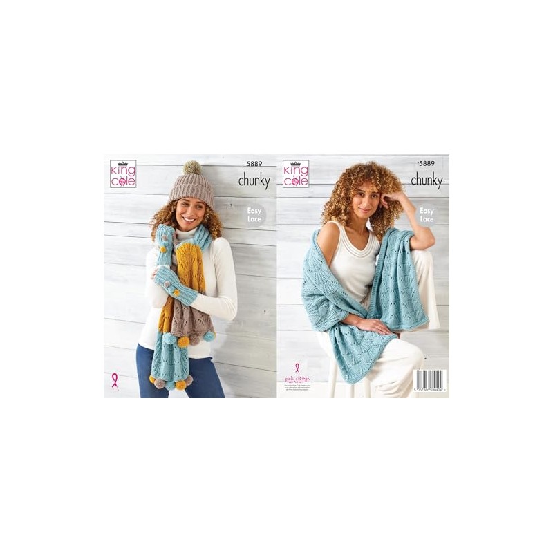 King Cole Ladies Chunky Knitting Pattern Easy Lace Wrap Scarf Hand Warmers & Hat (5889), Multi