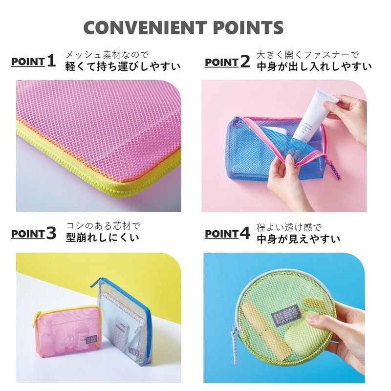 • Lightweight mesh pouch featuring pop color and sheer feel