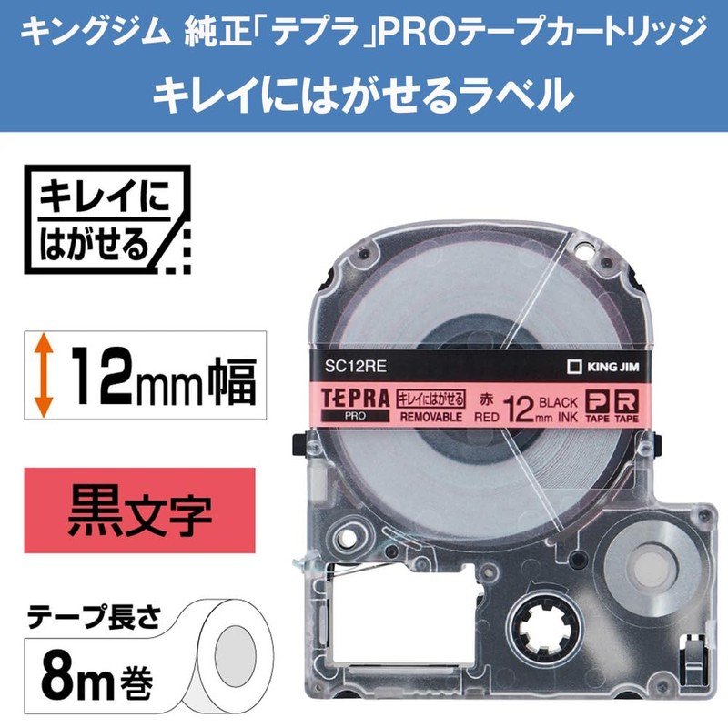 King Jim SC12RE Tepra PRO Tape Cartridge, Clean Removable Label, 0.5 inches (12 mm), Red Label/Black Character, Length 22.8 ft (8 m)