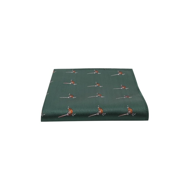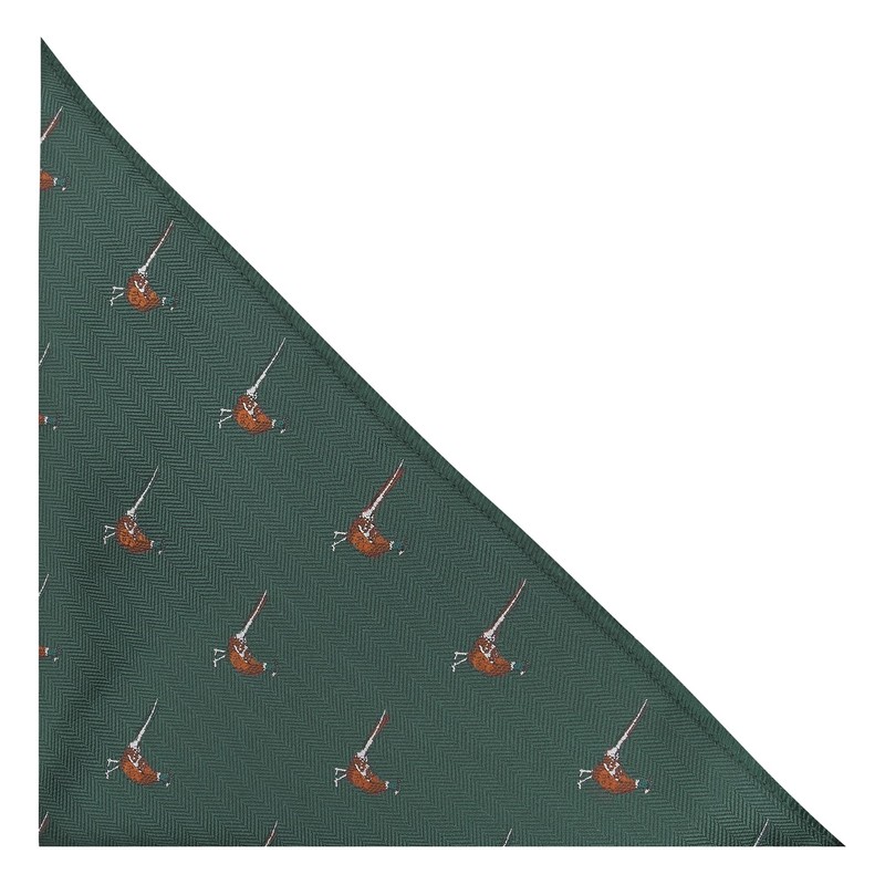 King & Priory Dark Green Herringbone Embroidered Pheasant Pocket Square, Handkerchief
