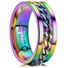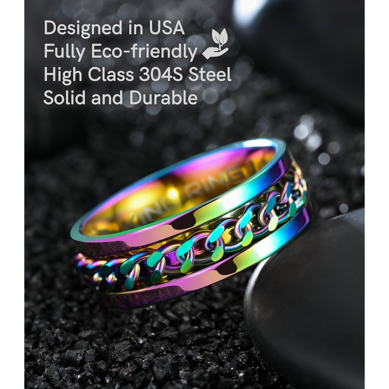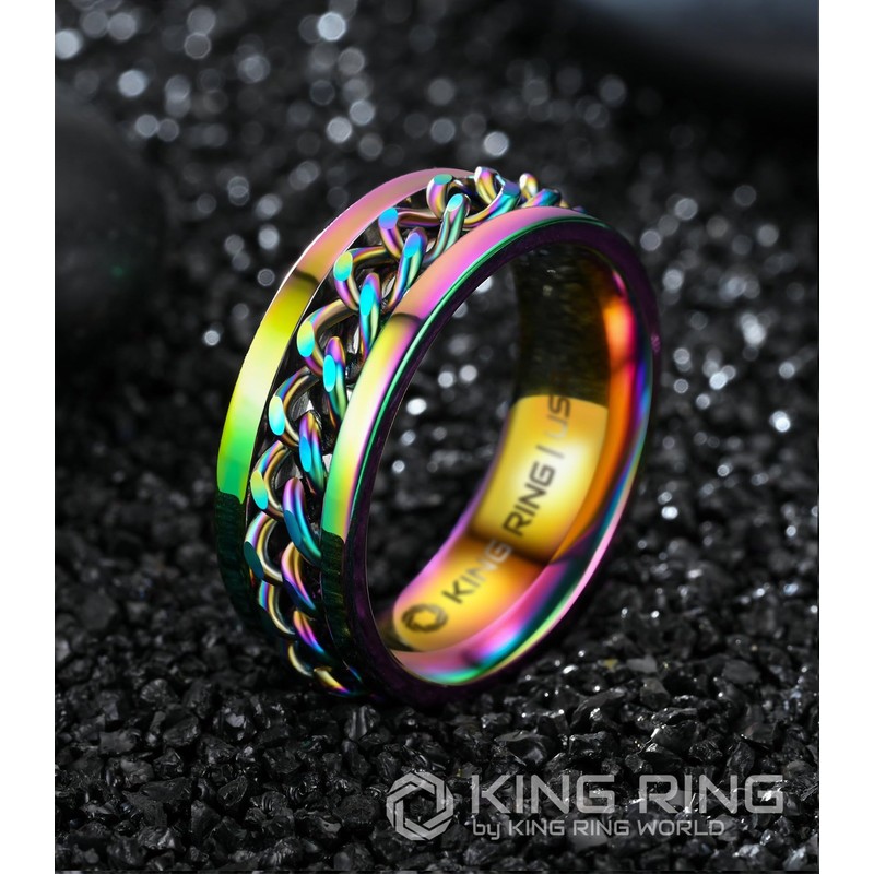 King Ring 8mm Multicolor Spinner Ring – Fine Polished Flat Fidget Ring for Men & Women with Cuban Chain, Rainbow Stainless Steel Ring – Multi 9