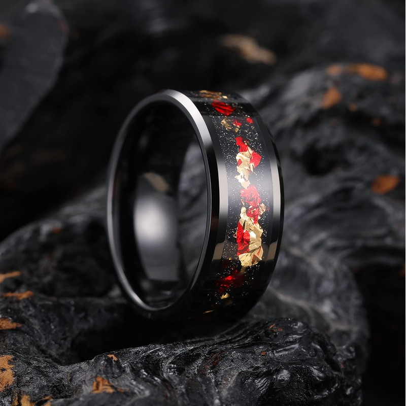- ✔️COOL DESIGN: Black 8mm Wide Red and Gold Foils Inlay Tungsten ring, Shine like Opal, unparalleled beauty of the galaxy.