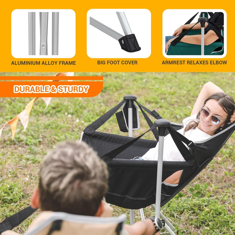 • STURDY: Differs from normal steel frame, KingCamp rocking camp chairs adopt high-strength 6063 aluminum alloy combine with bold steel, much more solid but lighter. Triangle cross support increasess the stability. Swing easily.