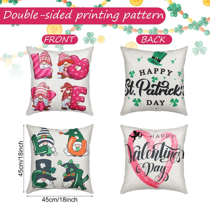 - Double Sided 2 Festivals Design: these linen square pillow covers are designed with 2 festival patterns, respectively, are St Patrick's Day and Valentine's Day, you can change them to a different side when a certain festival comes; And one pillow is with festival words while another is with gnome patterns, and the cute gnome, heart and shamrock patterns make them more attractive and romantic