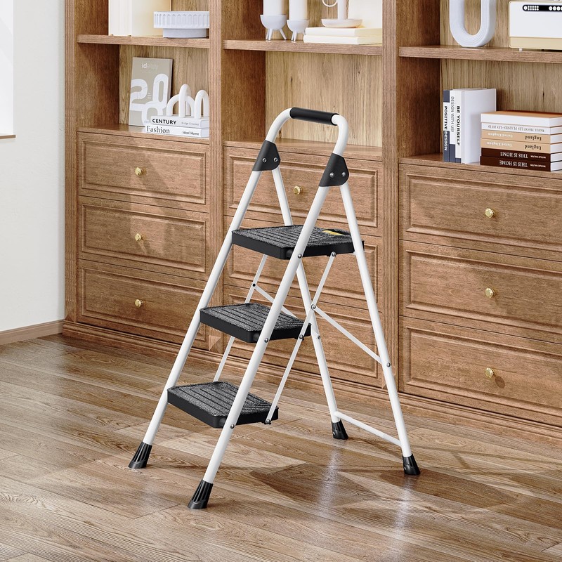- Heavy-Duty Construction: This 3-step ladder is built with a high-strength steel frame, ensuring exceptional durability and stability, with a maximum load capacity of 800 lbs, making it suitable for various tasks. Open dimensions: 18.1"L * 28.54"W * 40.94"H, folded dimensions: 18.4"L * 3"W * 45.2"H
