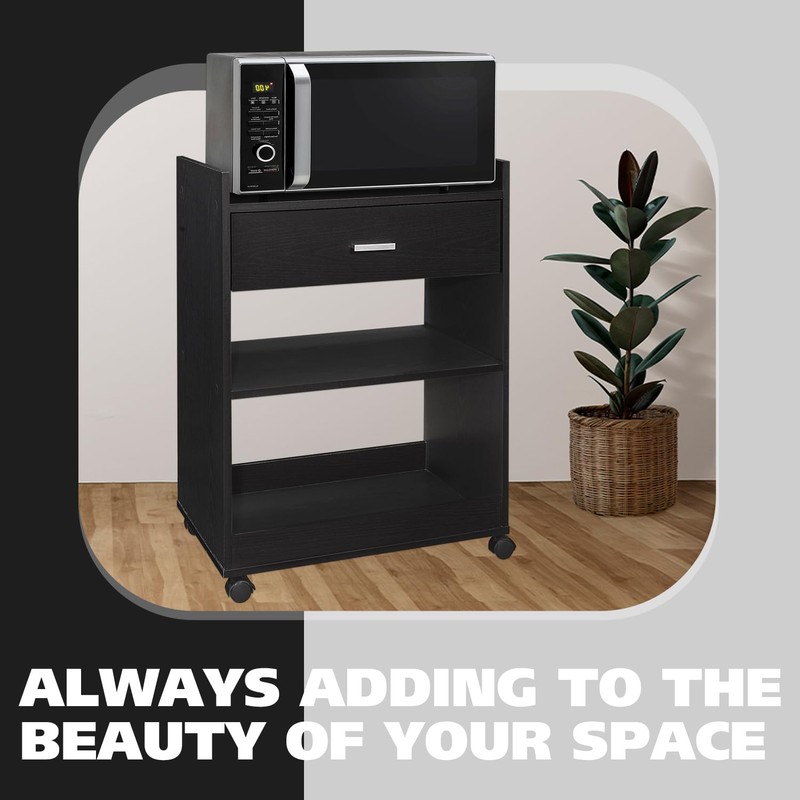 - MICROWAVE CART TABLE: Kings Brand Furniture Dellow microwave cart with wheels is an amazing product with an elegant and attractive look. This kitchen storage cart table with drawers and shelves is perfect for keeping your household and antique items anywhere you want. Due to its simple yet eye-catching design, it can be used in any space. This modern-style wooden cart with wheels adds a touch of fashion to your home and can be paired with any furniture accessories.