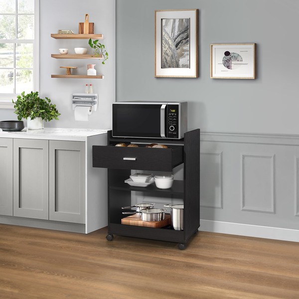 - CARE INSTRUCTION: To protect and keep the floor standing kitchen cart with shelves, wipe it with a dry cloth to increase its life span and an attractive look. This quality kitchen storage cart on wheels with a drawer is available in a black finish. Upgrade your microwave cart with drawer and shelf with a King's Brand Furniture Dellow wood kitchen cart with storage shelves.