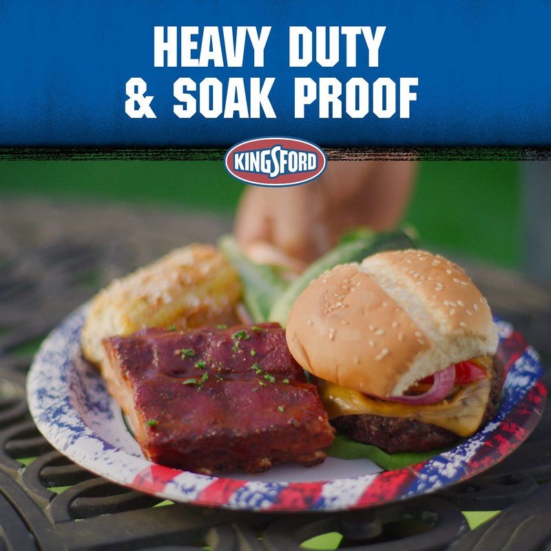 Kingsford aluminum pans, grill grates, grilling bags, aluminum foil, and paper plates are the perfect addition to any BBQ, cookout, or family dinner. Kingsford also offers a heavy-duty line of grilling tools and cleaners, making entertaining easier than ever. Kingsford Heavy Duty Soak Proof Plates in patriotic red, white, and blue pattern is the perfect way to bring on the summer spirit. Great for summer cookouts, these heavy-duty paper plates are strong and durable. They can withstand weighty foods like burgers and chicken wings and hold up in the face of a melting ice cream cake. Great for both outdoor and indoor use, these disposable paper plates are soak proof, meaning you won’t have to worry about leakage on your furniture. Cut resistant and microwave safe, Kingsford paper plates can be used for any type of meal. They’re versatile and easy, making it simpler than ever to invite guests over with little to no cleanup required. Order these soak-proof plates and you'll receive 35 Kingsford disposable paper plates. Kingsford and logo are registered trademarks of the Clorox Company and are used under license by Brand Buzz LLC. All rights reserved.YOUR SATISFACTION IS OUR PRIORITY- If you have any questions or feedback, please reach out to us directly at info@brandbuzzcp.com