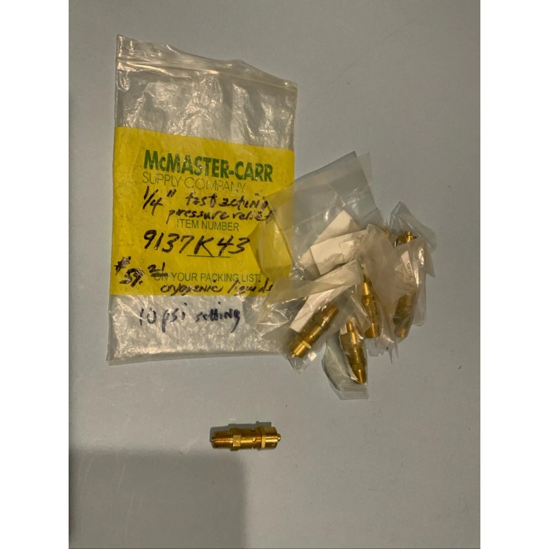 Kingston 1/4” fast acting pressure relief valve. 10 psi factory setting. Cleaned and bagged for oxygen service and other high purity applications. These valves can withstand the extreme cold of liquid argon, liquid nitrogen, and liquid oxygen. They spring fully open at the 10 psi pressure setting. Remain open until the system pressure is restored below the pressure setting. Vented relief port to exhaust discharge directly. I have 9 available. Can be purchased from McMaster-Carr with part #9137K43. Last price I got from them was $59.21 each.