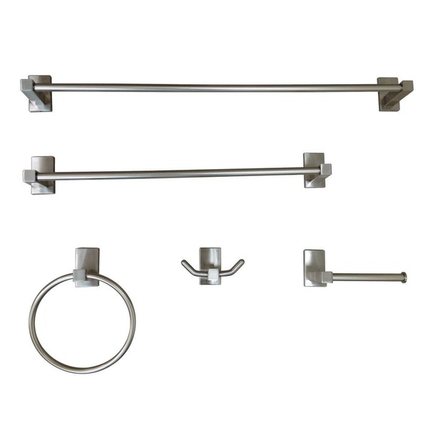 - Set Includes 1 each: 24" towel bar, 18" towel bar, towel ring, robe hook and toilet paper holder