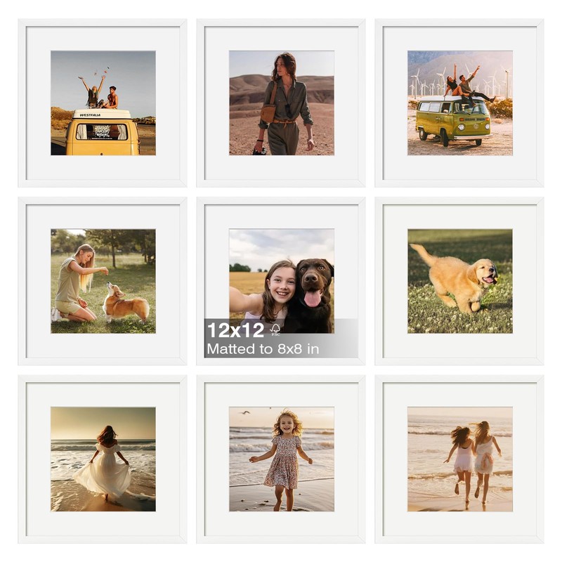 KINLINK 12x12 Picture Frames, White Frames with Plexiglass for Picture 8x8 with Mat or 12x12 without Mat, Composite Wood Picture Frames for Table Top and Wall Mounting, Set of 9