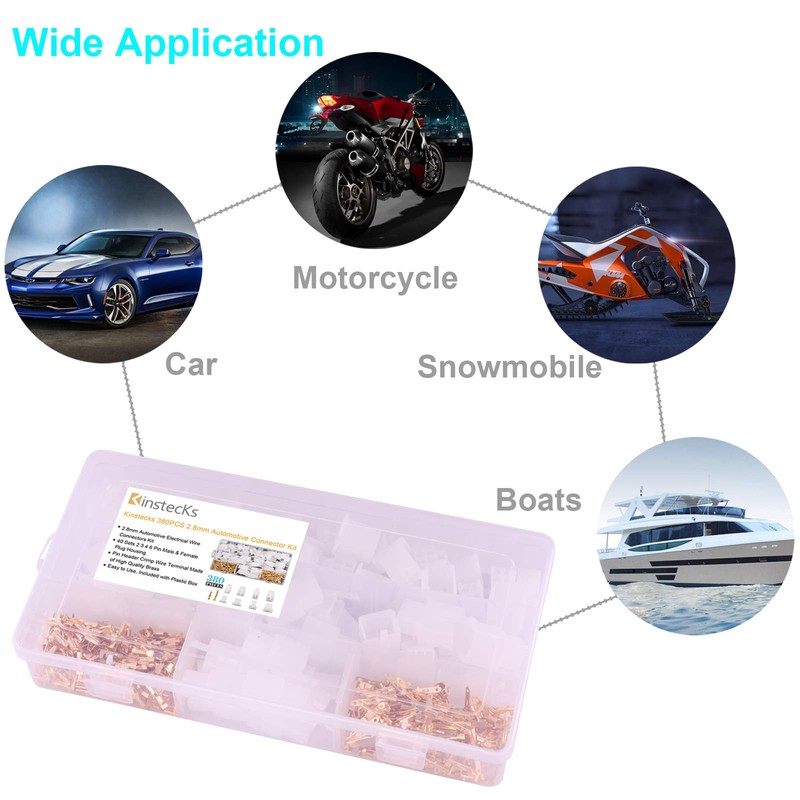 - 2.8 mm blade receptacles blade connector set: 380 pieces blade receptacles flat plug set, a best kit for your motorcycle, motorcycle, car, truck, scooter, boat, electric instruments