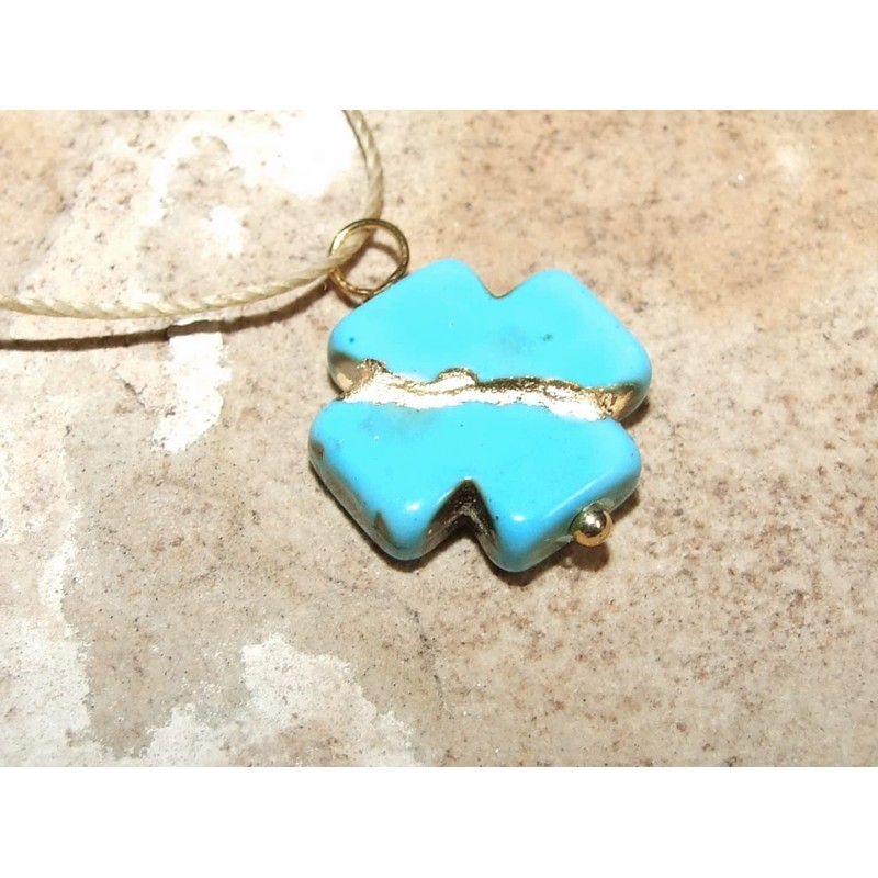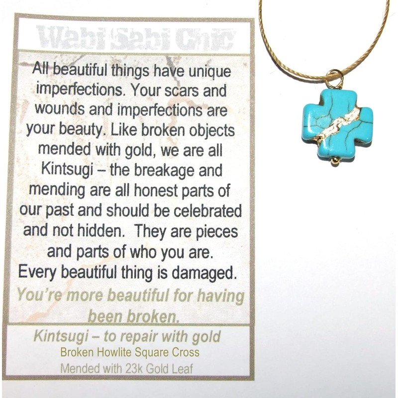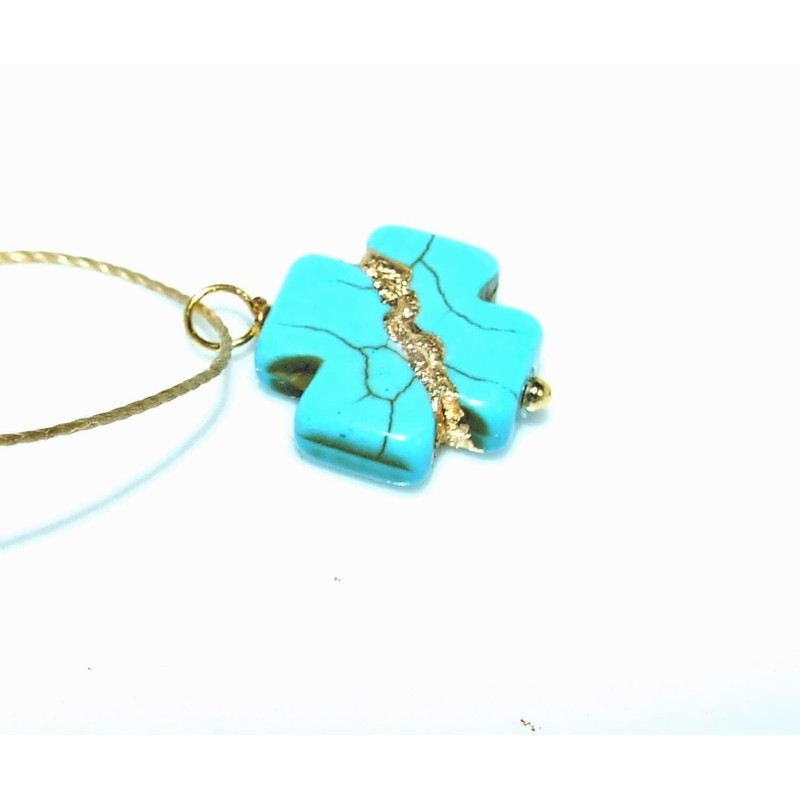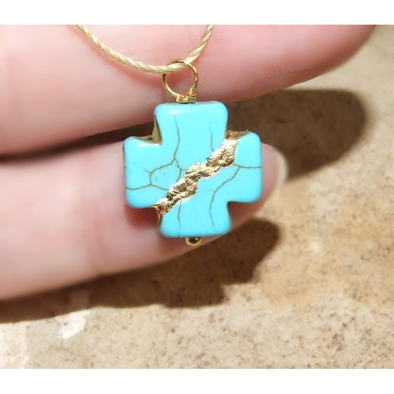 PENDANT: Turquoise howlite. The cross is 16x16mm and is 4mm thick. It is broken then mended on all sides as shown, using the Kintsukuroi technique and finished with genuine 23k gold leaf. Smooth and polished.