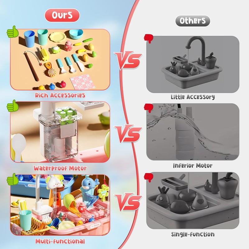- VERSATILE PLAY: The play sink with running water feature adds excitement and teaches children about water flow and basic physics while they play.