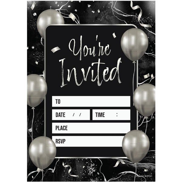 Kirsten McMillan 32 Black Silver Balloons Party Invites - Party Invitations Adult - A6 Birthday Party Invitations with Envelopes – Designed and Printed in the UK